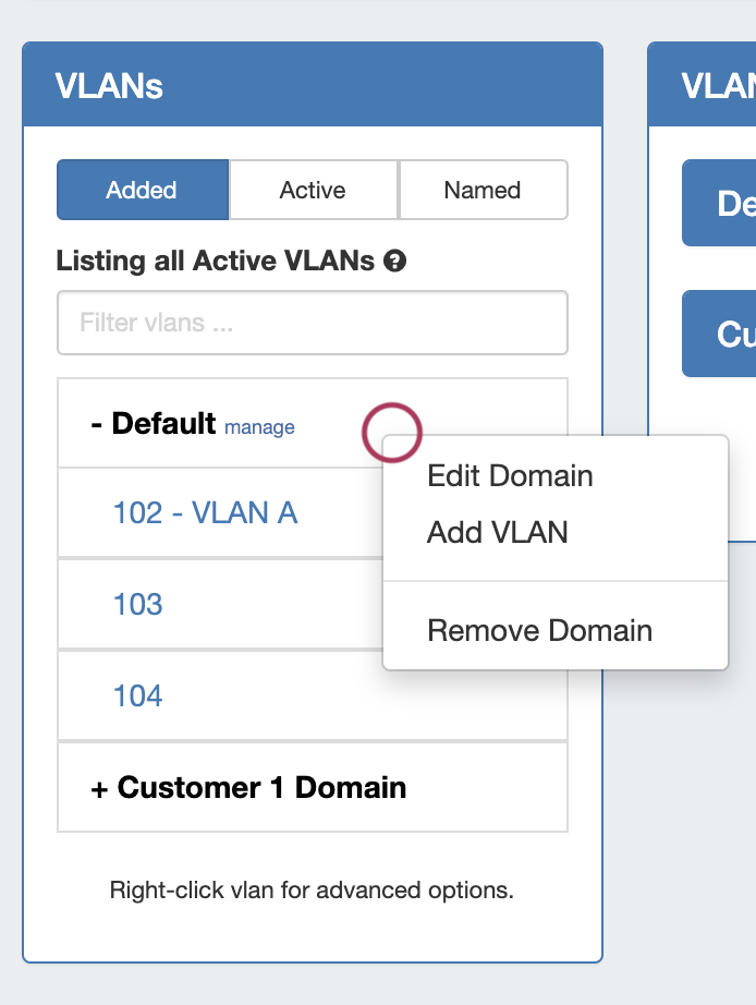 • Right click to open context menus for both Domains and VLANs