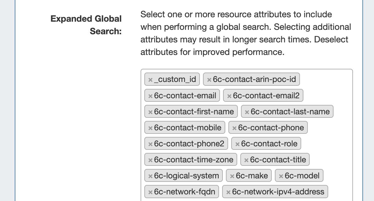 Expanded Global Search options, located under Admin Settings → Application Settings, allows admins to customize which resource attributes are included in Global Search, and balance search scope vs performance.