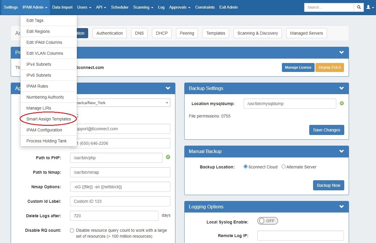To access Smart Assign Templates from the Admin section, select "Smart Assign Templates" from the IPAM Admin tab dropdown menu.