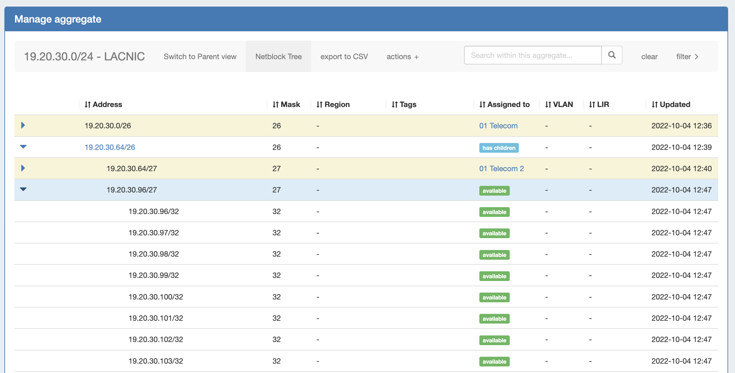 Now, go back up and try to expand 19.20.30.64/26. You will see expandable branches with mask /27, because 19.20.30.64/27 is assigned to '01 Telecom 2'. Since a change in assignment was detected at this level, branches were created for both the assigned block and its available sibling block.