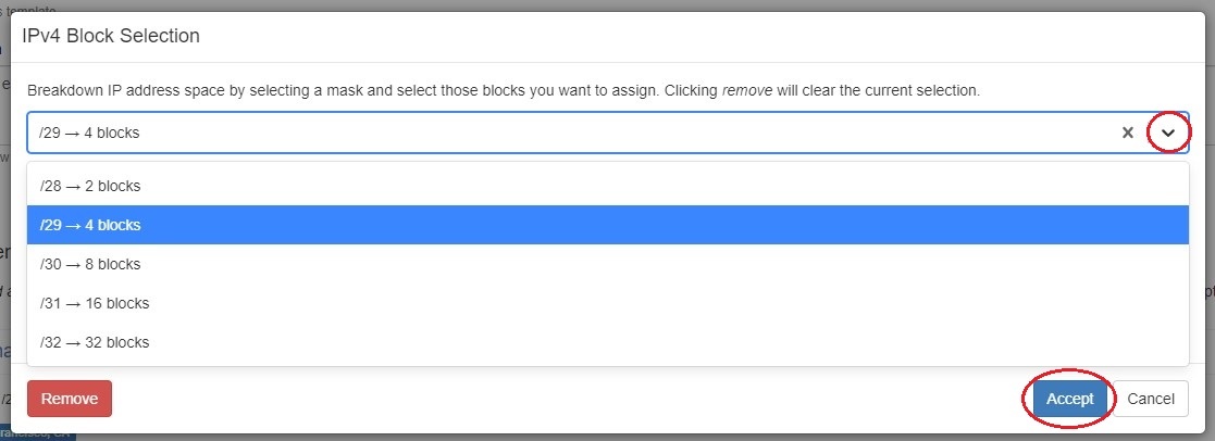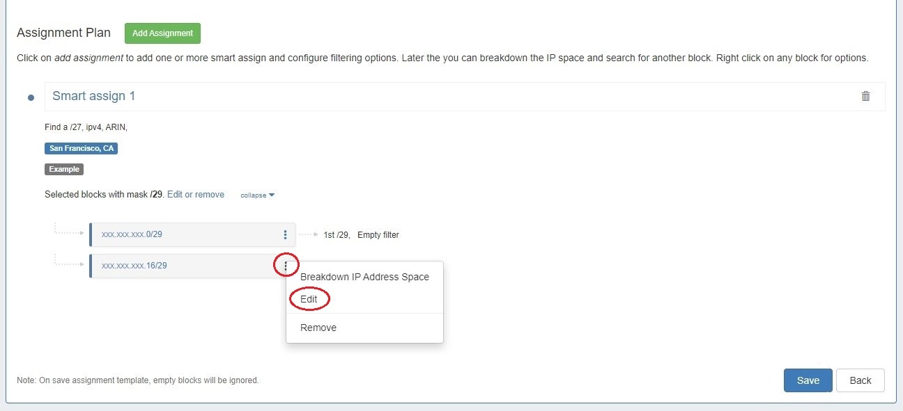 To configure filters for a block, click on a block menu to open the Action Menu and select "Edit". The block can be further broken down by selecting "Breakdown IP Address Space" or removed by clicking "Remove".