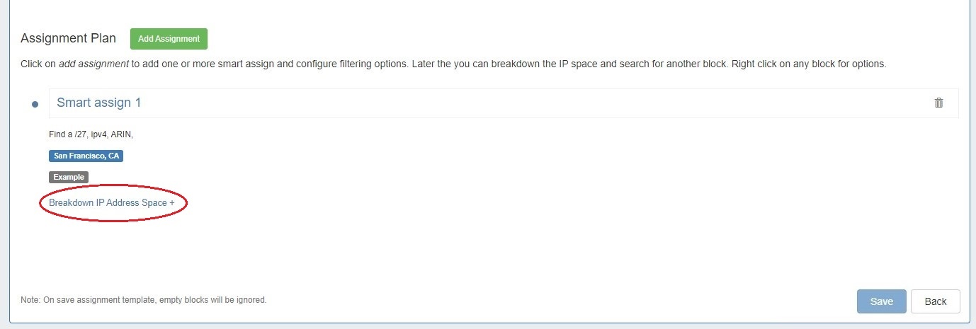The template may be saved at this point by clicking "Save" at lower right. IP space may be broken down prior to saving or at a later time by editing the template.