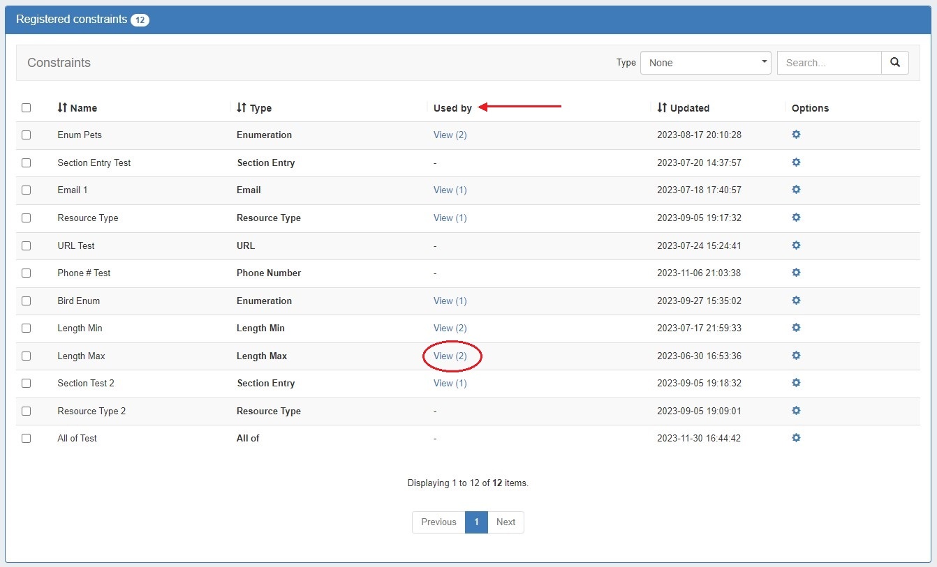 Simply click the constraint's "View" link in the "Used by" column and a modal will open. Click the link for a resource field to see which sections have that field enabled. Click a section name to go to the Section Edit page. Click the link for a IPAM column to go to the Edit IPAM Columns page. Constraints can be applied or removed from both these locations. See (8.3.0) Constraints for more details.