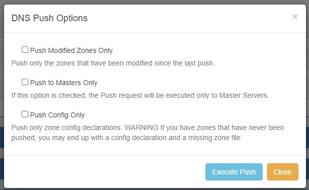 Users can choose to push only modified zones, push to master servers only, or push only zone config declarations.