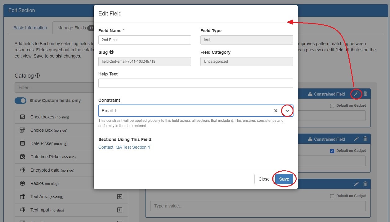 Applying a constraint to a field affects all sections to which a field is assigned. In the above example, adding a constraint to a field in QA Test Section 1 will also apply the constraint to the field in the Contact Section. You can see which sections are using the field displayed in the Edit Field modal.