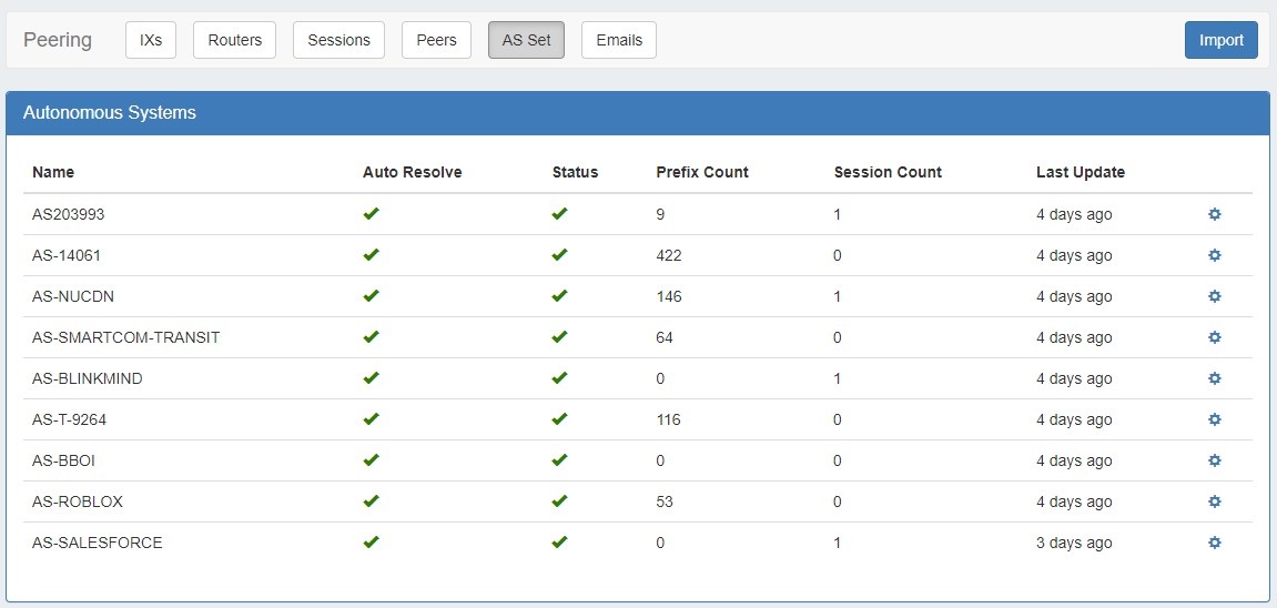 To Import an AS Set click the "Import" button at upper right of the Peering section AS Set subtab. Enter a prefix and click "Search".