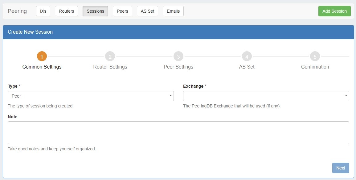 The Peering Add Session form has been updated to a five step wizard format.
