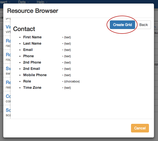 The Resource Browser will pop up, showing the list of Sections currently available in Provision. Clicking on the "Details" button will show the fields for that Section.