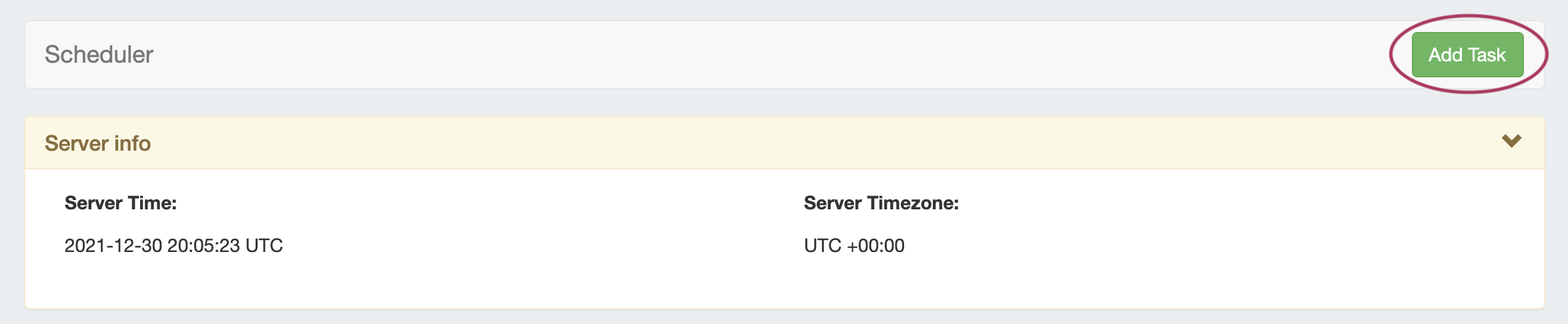 To add a new scheduled task, hit the "Add Task" button on the right side of the Scheduler page header bar.