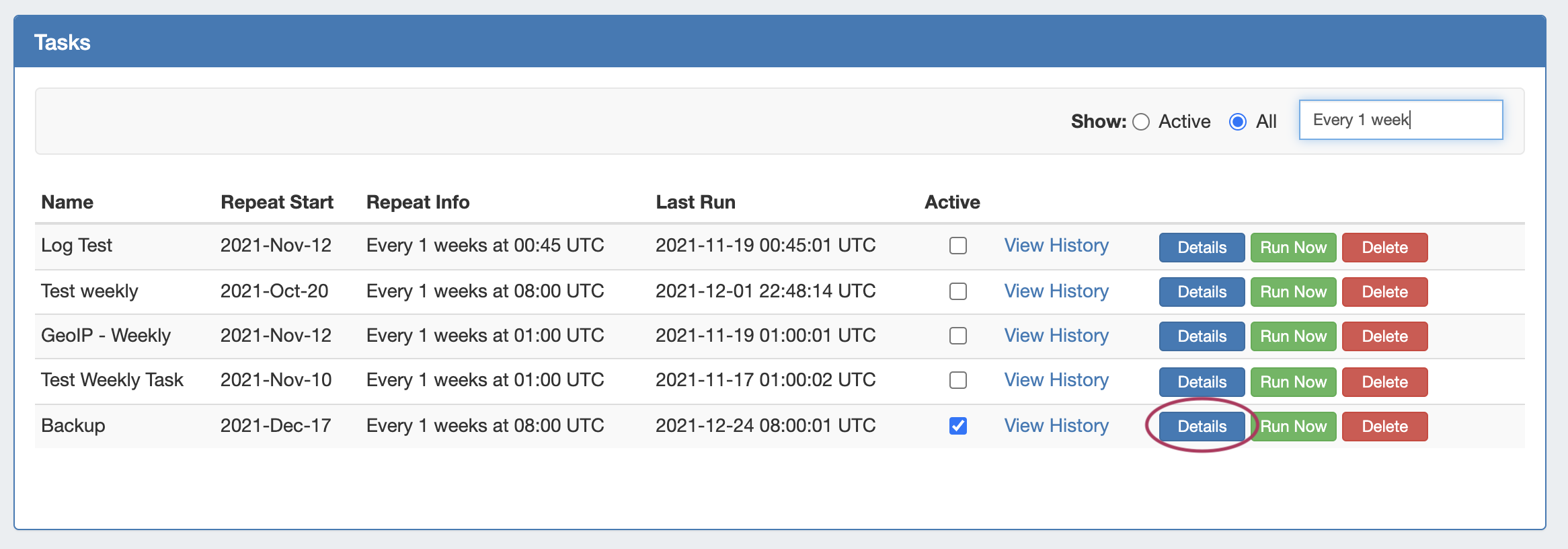 Show: Select "Active" to show only active tasks (checkbox enabled under "Active" for the task), or "All" to show all tasks