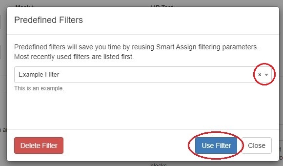In the Smart Assign Filters modal, select the smart assign filter criteria to use for this assignment, or select a predefined filter from the gear menu at the upper right corner.