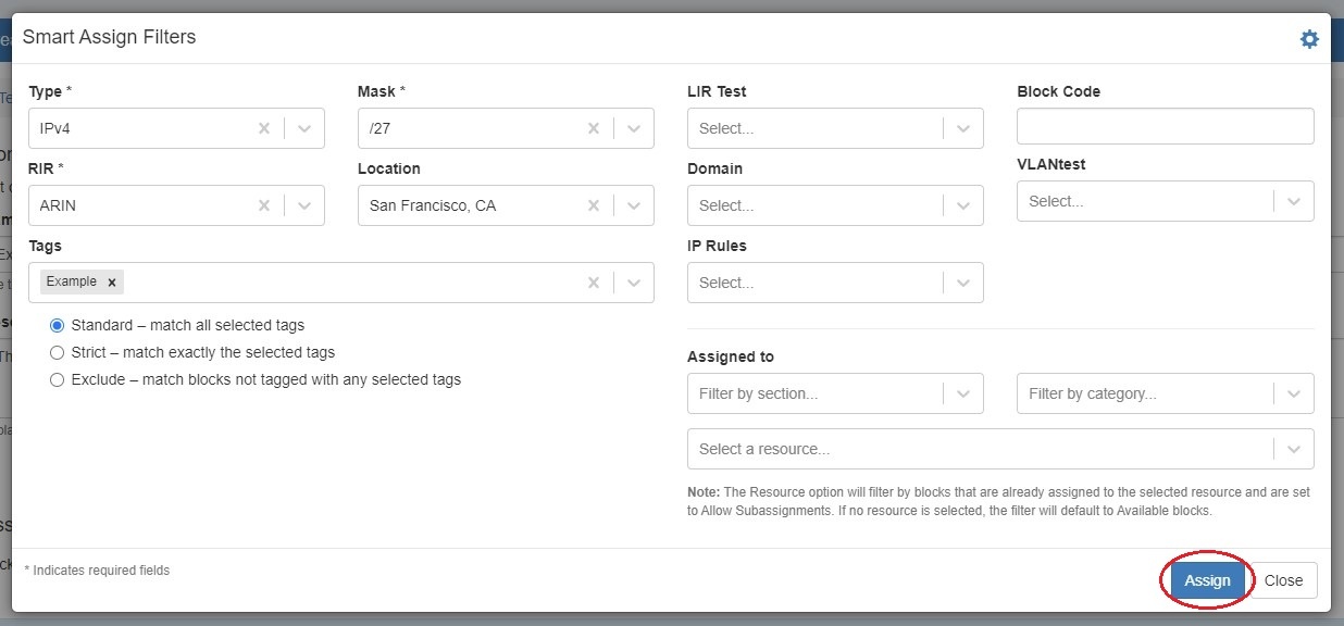 Like Smart Assign, Smart Assign Templates allow you to enter criteria such as IP type, size, RIR, region, and tag information to automatically assign a block meeting that criteria, if any exist. But Smart Assign Templates allows users to breakdown IP space even further through multiple levels of conditions for more complex assignments. For example, if you need a /24 from Resource A with Tag B, then want to take the first /28 of it and sub-assign that to Resource C, and then take the last /30 of it and assign it to Resource D - you can create a template to do just that.