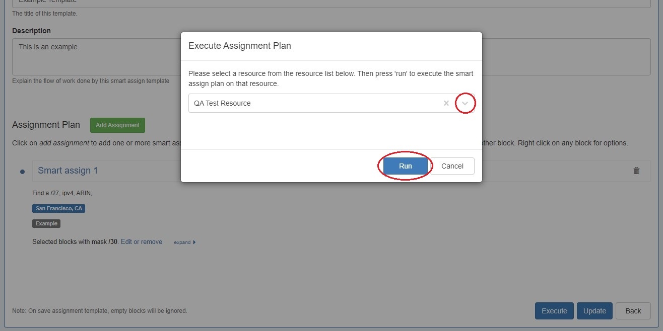 To run the template from a Resource's IPAM Gadget, open Smart Assign and select the template from the "Smart Assign Templates" dropdown and click "Execute".