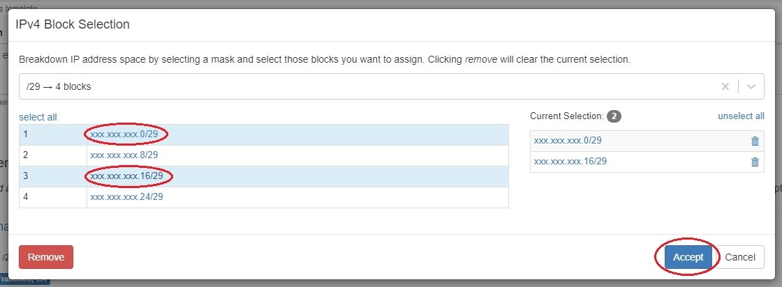 Click on a block CIDR to select that position for assignment, or you may select all. A block may be deselected by clicking the delete icon. Click "Accept" when done.
