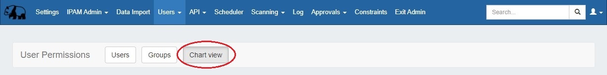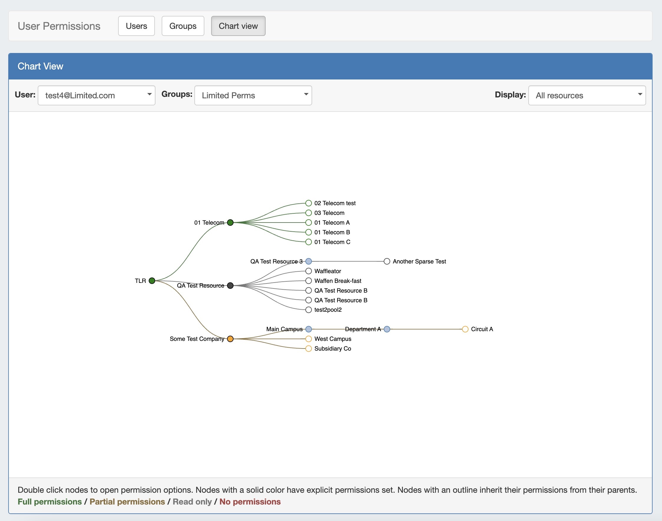 Once in Chart View, you can graphically view the permissions level of a user by selecting their user name and group from the dropdowns at the top of the chart.