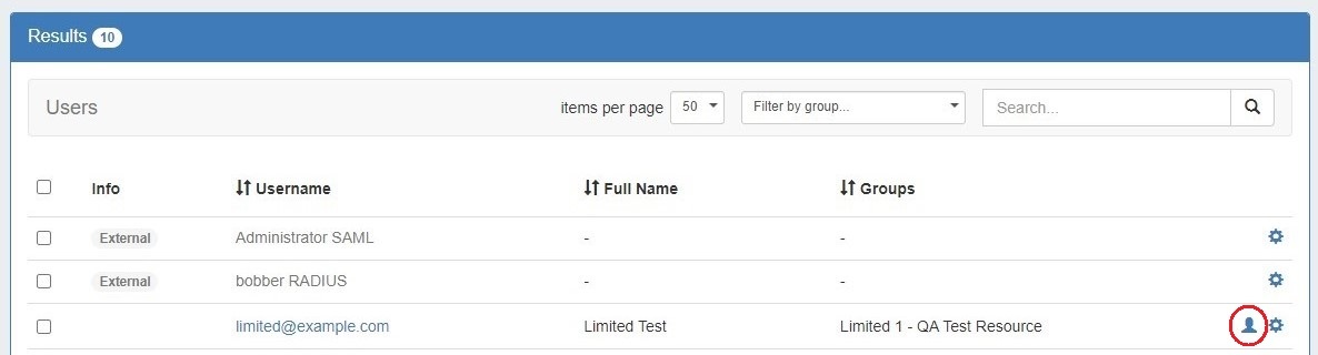 To verify the permissions of a certain user for a specific resource, open "User Details" for the user from the action menu or by clicking on their username.