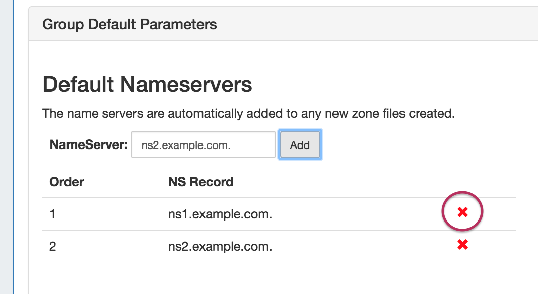 Delete a non-Default Group by clicking on the "X" to the left of the group's name in the DNS Groups List.