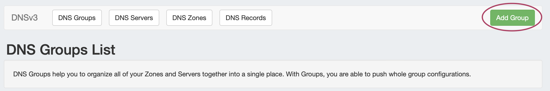 To create a new Group, from the DNS Tab, select the DNS Groups sub menu. Then, click the "Add Group" button at the top of the page.