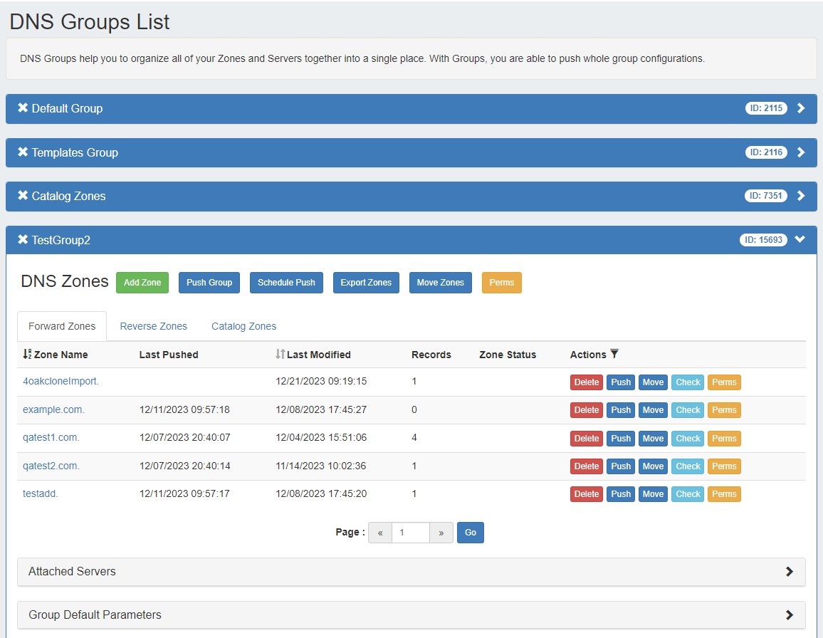 DNS groups allow for organizing multiple zones together and linking those zones with one or more servers. Default nameservers, SOA values, and ACL's are set at the group level, so different groups may have their own default values. Zones may be pushed individually, as a group, or at the server level.