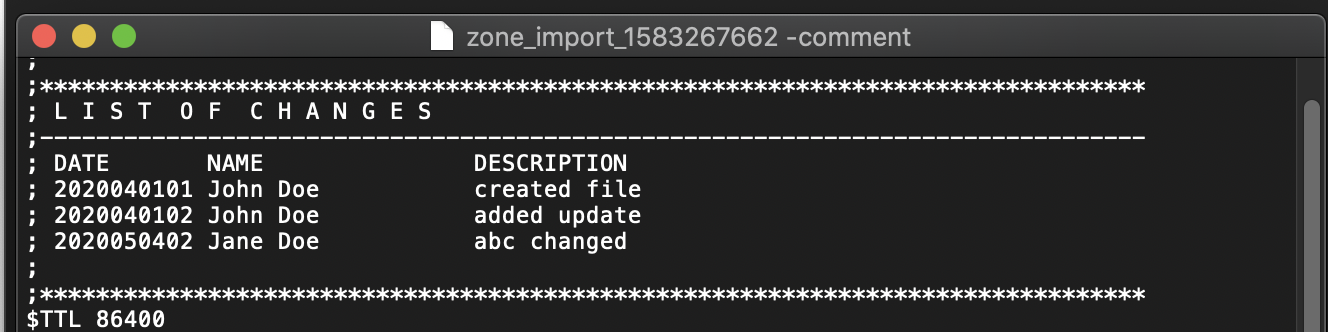 DNS Zone Import will also import comments contained in the .zone file, such as an internal change log (as seen in the image below).