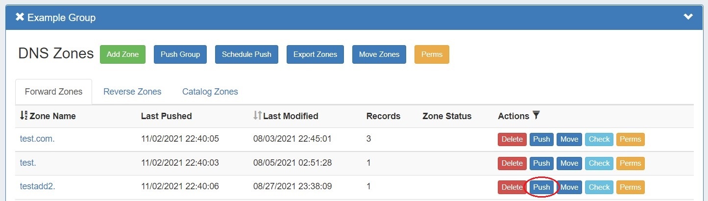 To immediately push a single zone, navigate to the DNS group the zone is under, then click the "Push" button in the Actions column for the zone.
