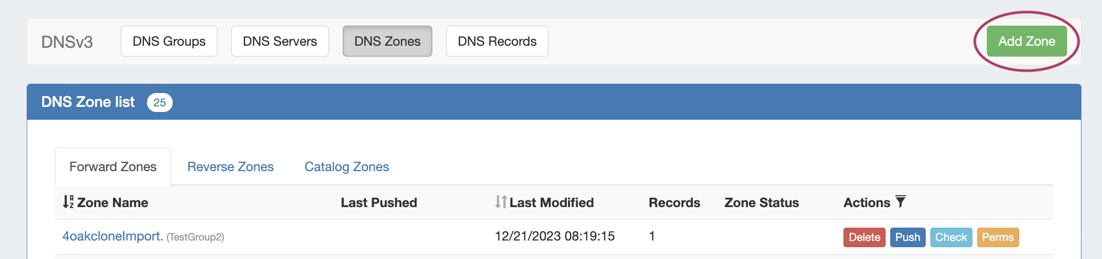 Users with resource delete permissions over the zone may delete a zone record by clicking the "Delete" button under "Actions" for the desired zone entry in any Zone List.
