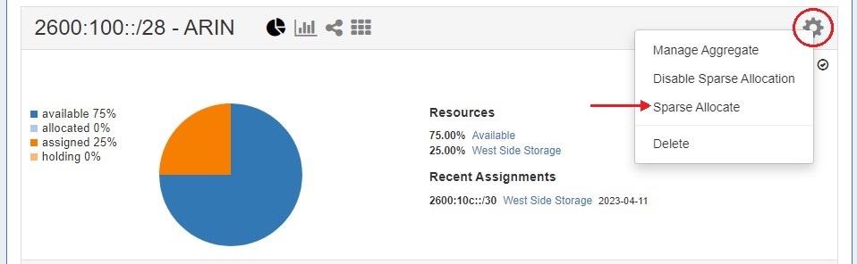 Sparse allocation options are accessed from the IPv6 Aggregate's Action Menu (gear icon). The top right corner of the Utilization module for the IPv6 aggregate will display whether sparse allocation is enabled or disabled for the particular aggregate.
