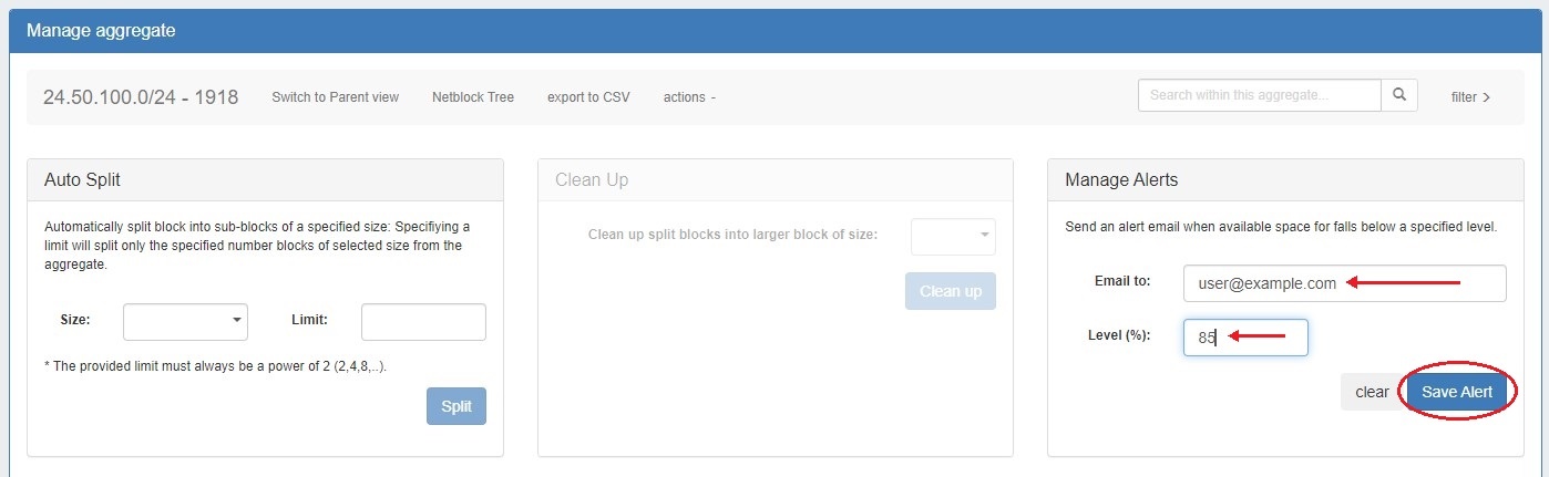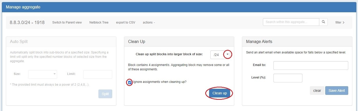 From IPAM Manage, you can perform the aggregate template actions of Auto-Split / Clean-Up, Set IPAM Alert information, export the block list, as well as manage individual blocks.