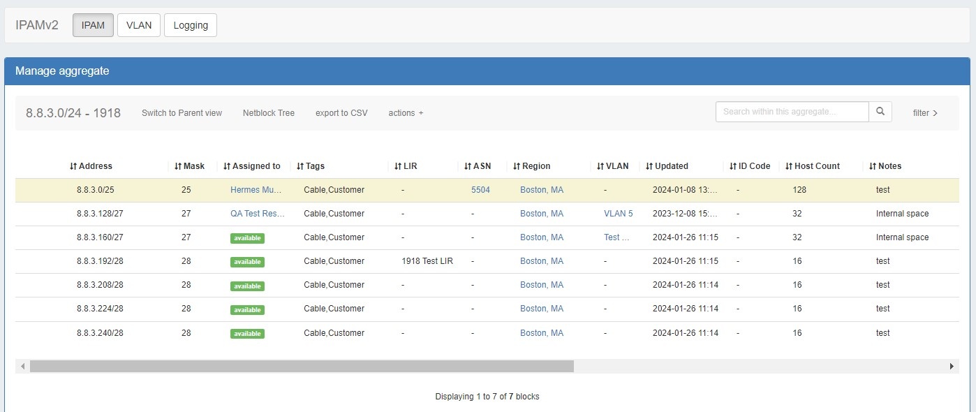 For an overview of the IPAM Tab, see (8.3.0) IPAM Tab. For information on working with individual blocks, continue to (8.3.0) Working with IP Blocks.