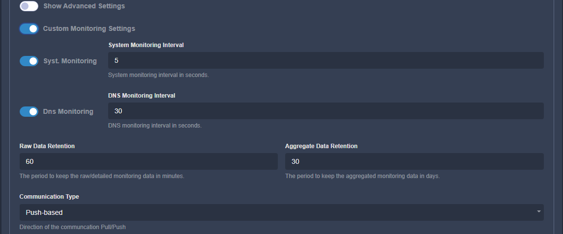 This will be toggled if the user has set custom settings earlier or during the setup. The fields are the same as in theMonitoring Settingsstep during setup and are described there.