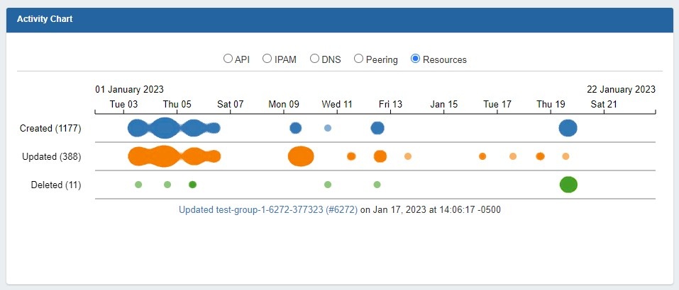 Radio Buttons: Select the desired activity area to view by clicking on the radio buttons (API, IPAM, DNS, Peering, or Resources).