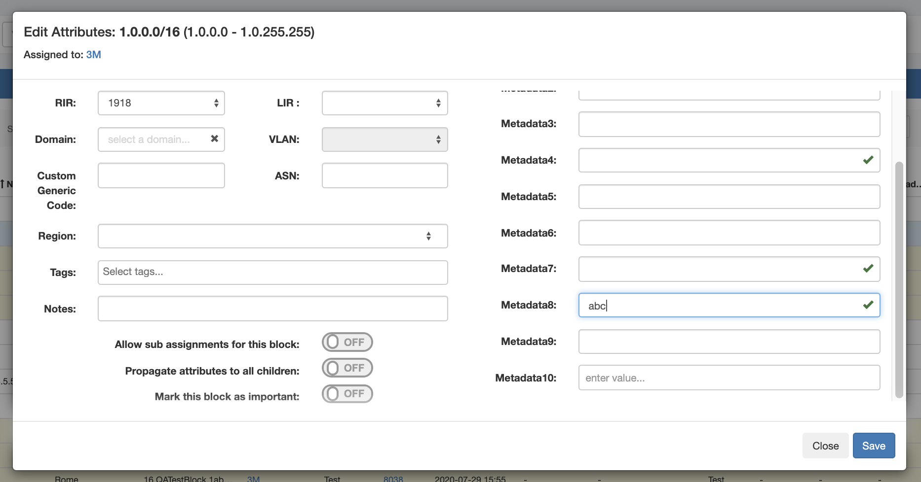 When a field is viewed in IPAM Manage that has a constraint applied, a "check" icon will display next to the field input for simple input constraint checks, if empty values are allowed.