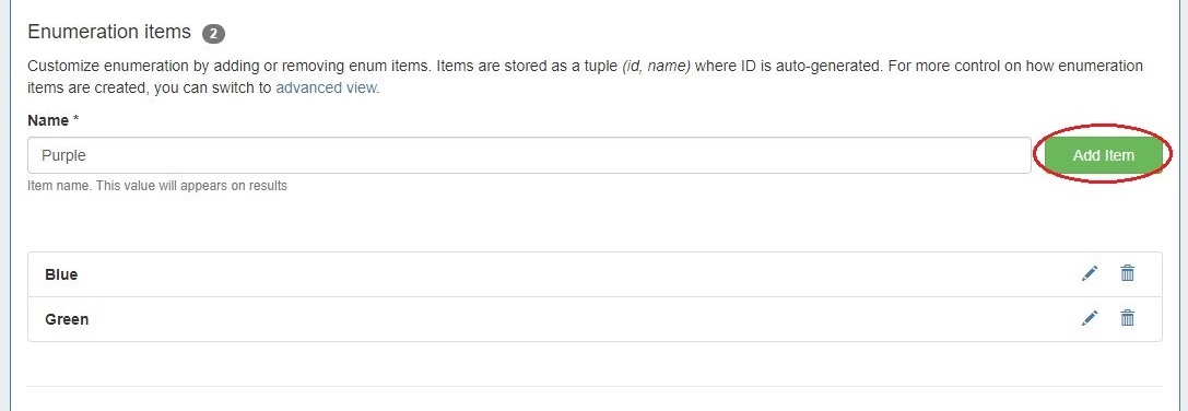 In the section "Enumeration items" enter a name for an option and click "Add Item". Repeat for any additional values that you wish to make available in your enumeration dropdown. You can edit or delete options via the row icons.