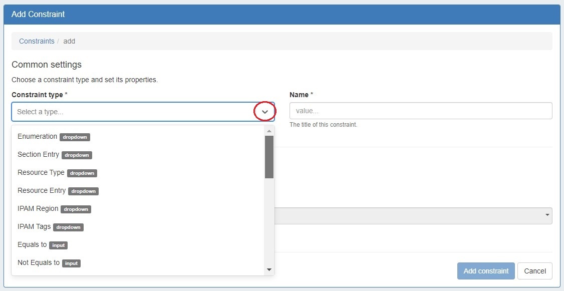 The Constraint type selector indicates the control type of any given constraint (i.e. dropdown, input).