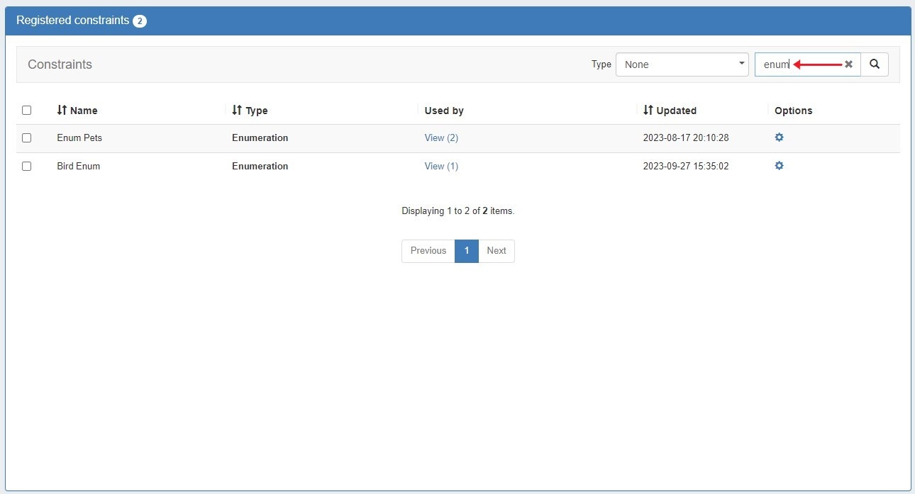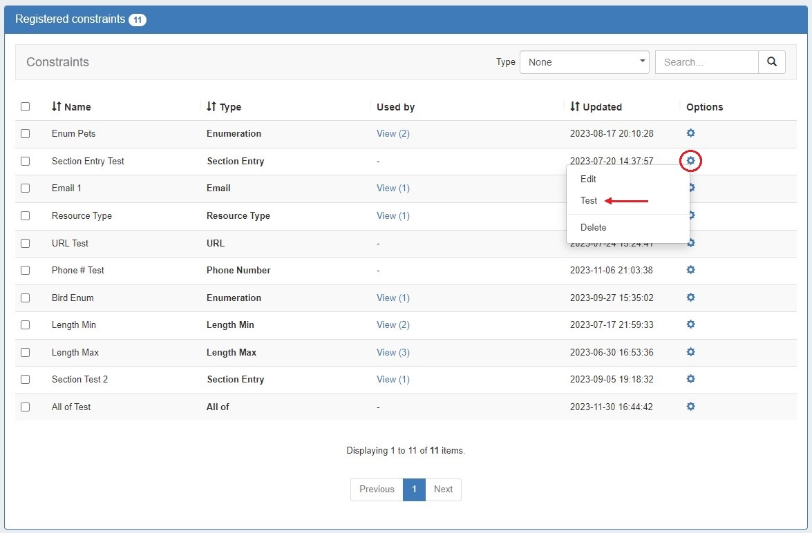 The Constraints List displays all registered constraints and is where you can view, edit, test, and delete existing constraints.