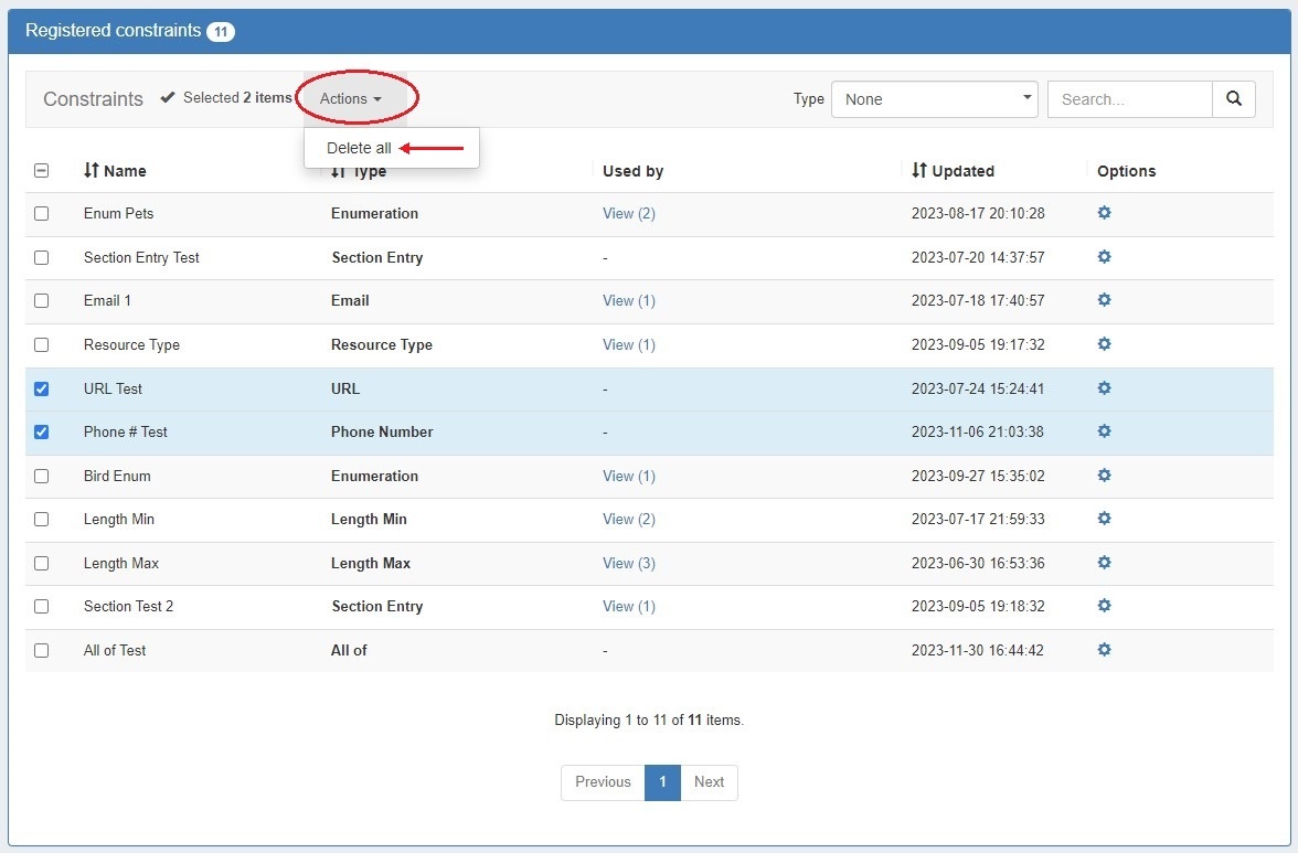 To do so, select the checkboxes for the desired constraints, then under the "Actions" menu at the top of the list, select "Delete All".