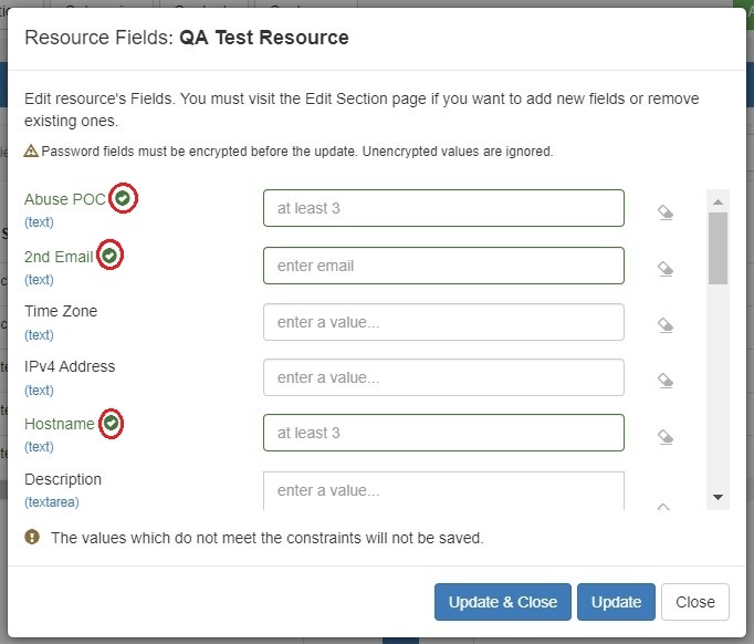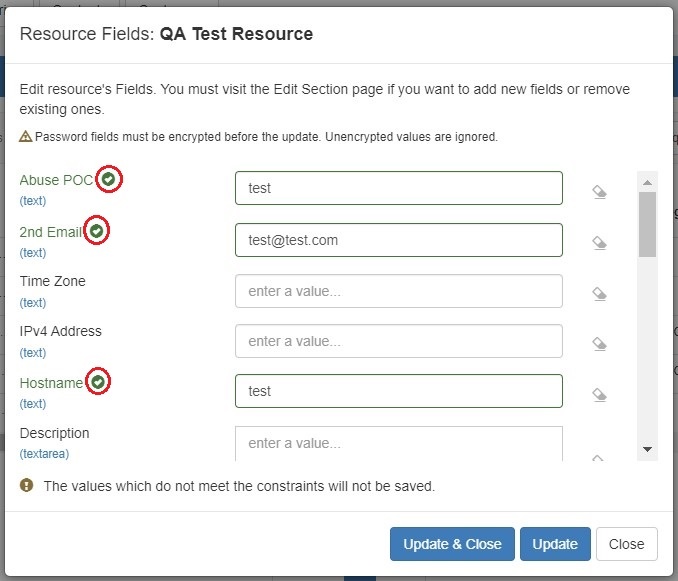 The Constraints system allows Admin users to configure custom field validation and limitations into IPAM and Resource fields. Many constraint types are available, such as mathematical comparison operators, length, enumeration, pre-set lists, RegEx, IPv4/IPv6, Phone, email, hostname, FQDN, Mac Address, and URL.