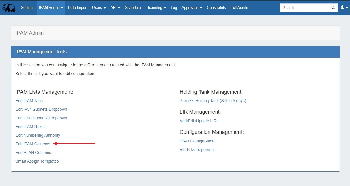 To apply a constraint to an IPAM field, go to IPAM Admin → Edit IPAM Columns.