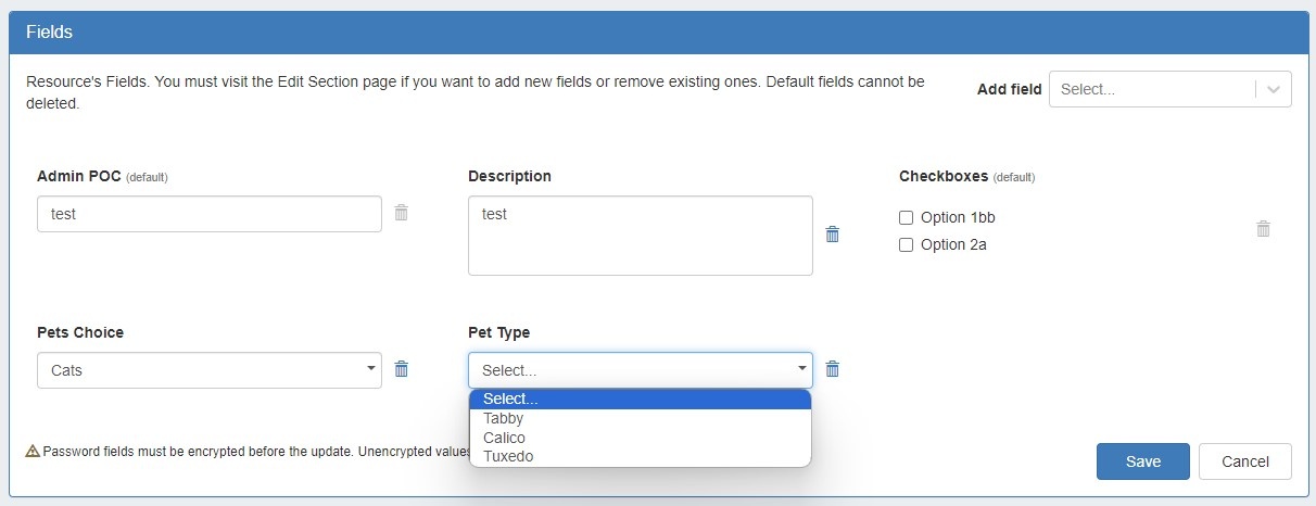 A constrained field is available to edit from the Resource List Edit Fields modal and the Resource's Fields Gadget.