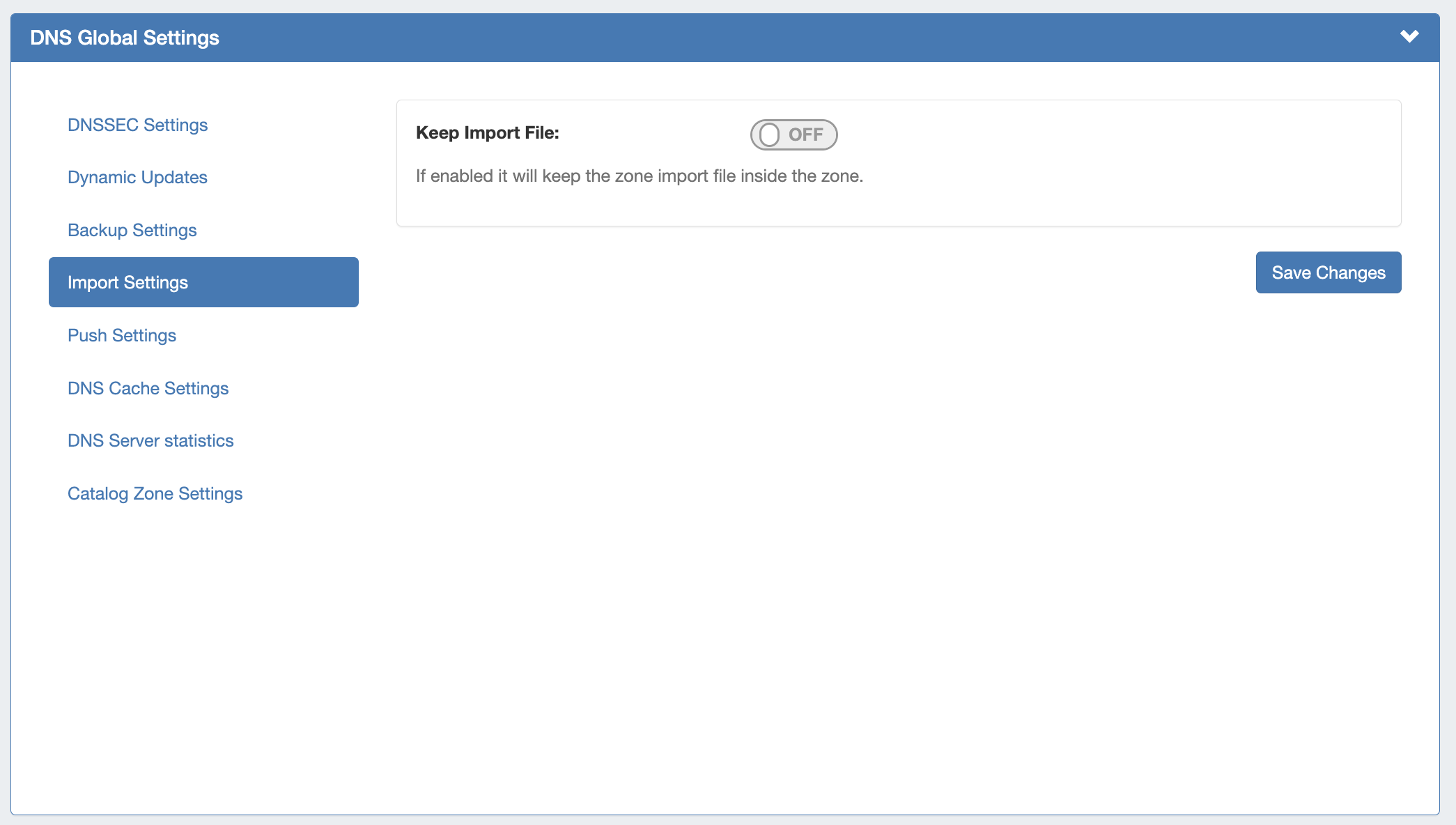 - Keep Import File: Saves DNS zone import files to the zone's "Zone Backups and Attached Files" area, for later download. Optional.