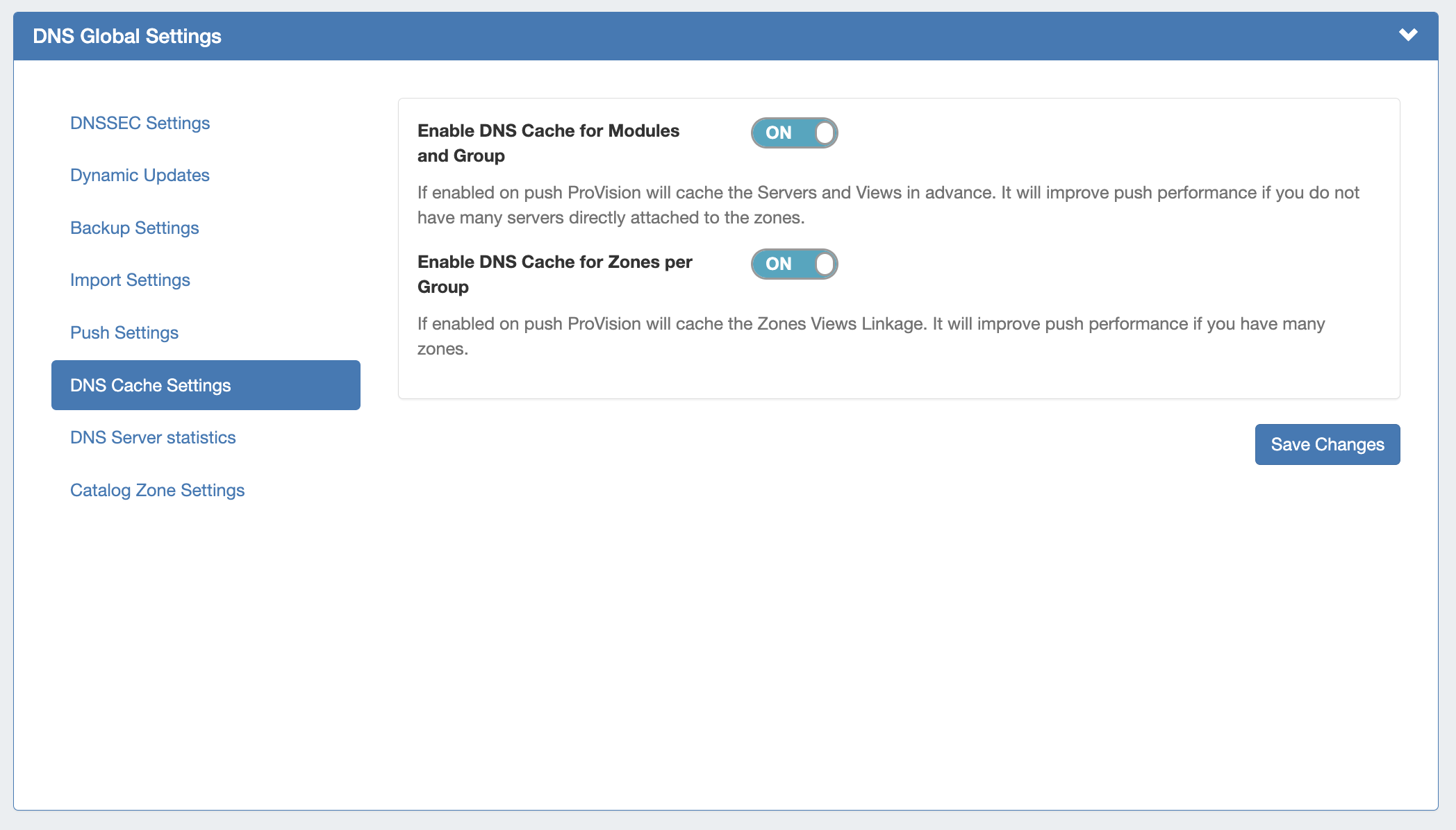 - Enable DNS Cache for Modules and Group: If enabled, on push ProVision will cache the Servers and Views in advance. Improves push performance, if you do not have many servers directly attached to the zones.