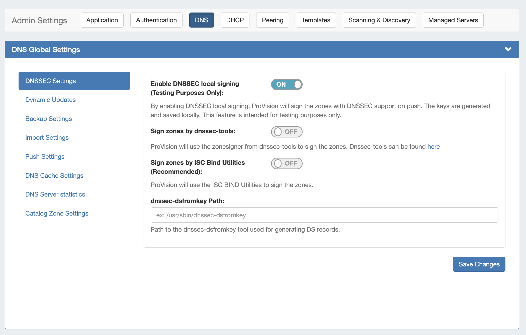 - Dynamic Update via nsupdate: Toggle to "On" if you wish to use Dynamic Updates via nsupdate, instead of ProVision's internal implementation.