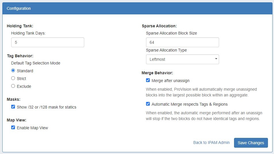 - Enable Map View: Select to enable a map view of assigned aggregates on the IPAM tab, determined by assigned region.