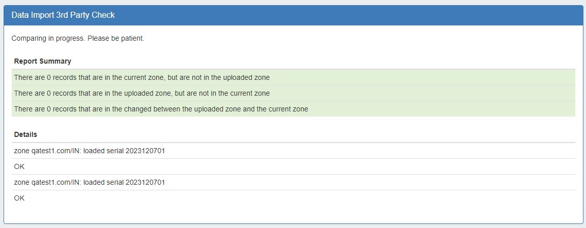 The resulting comparison will verify the zone matches the uploaded file or highlight differences found between the two.