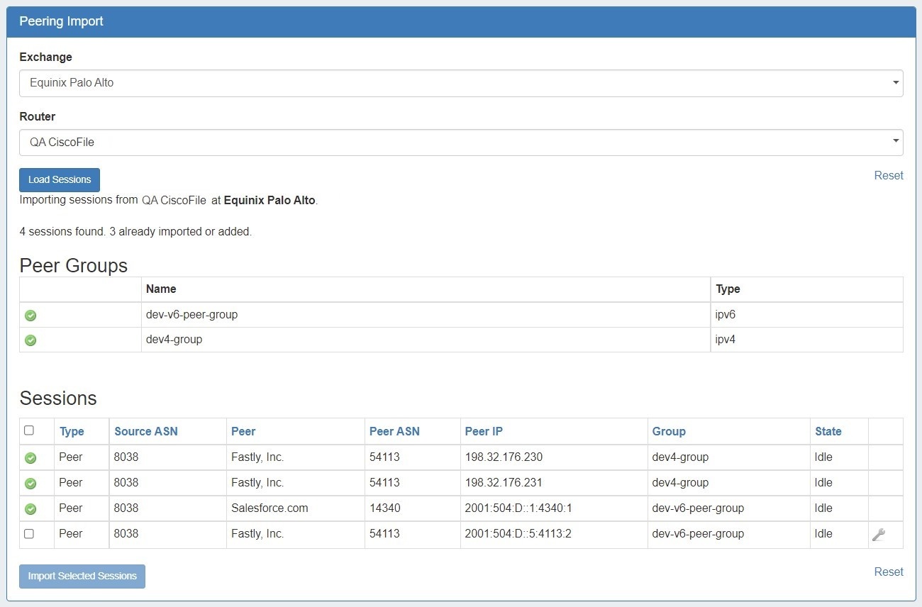Once imported, you can manage and configure your sessions from the Peering Tab.