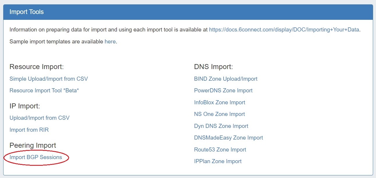 Importing peering sessions requires Admin-level permissions, and is accessible only from the Admin section of ProVision.