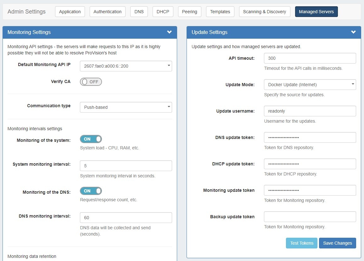 • Test Tokens: Click to test the applied tokens for DNS, DHCP, and Monitor.