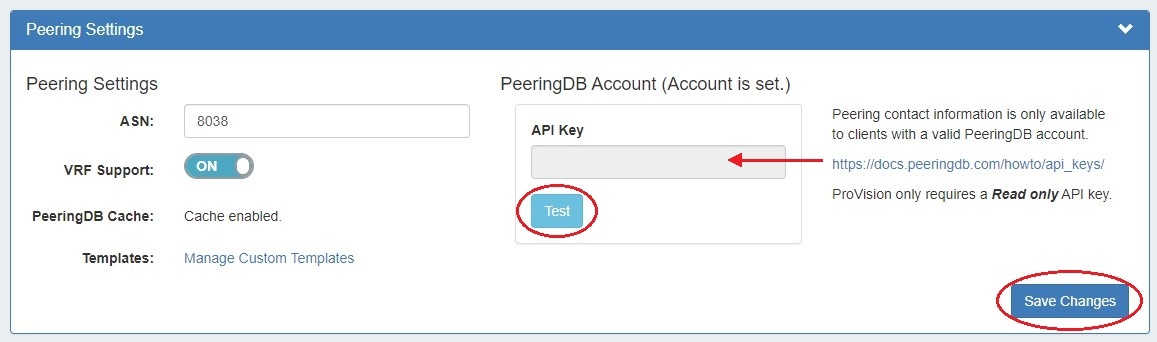 Enter the PeeringDB credentials and click "Test". Remember to save your changes.