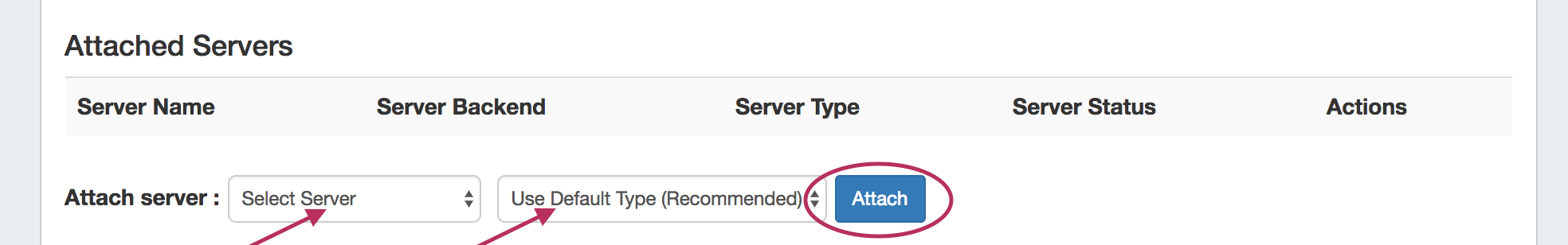 Under the "Attached Servers" section of the Zone View page, next to "Attach Server:", select the desired server to attach and choose the server type (Default, Master, Slave), then click the "Attach" button.