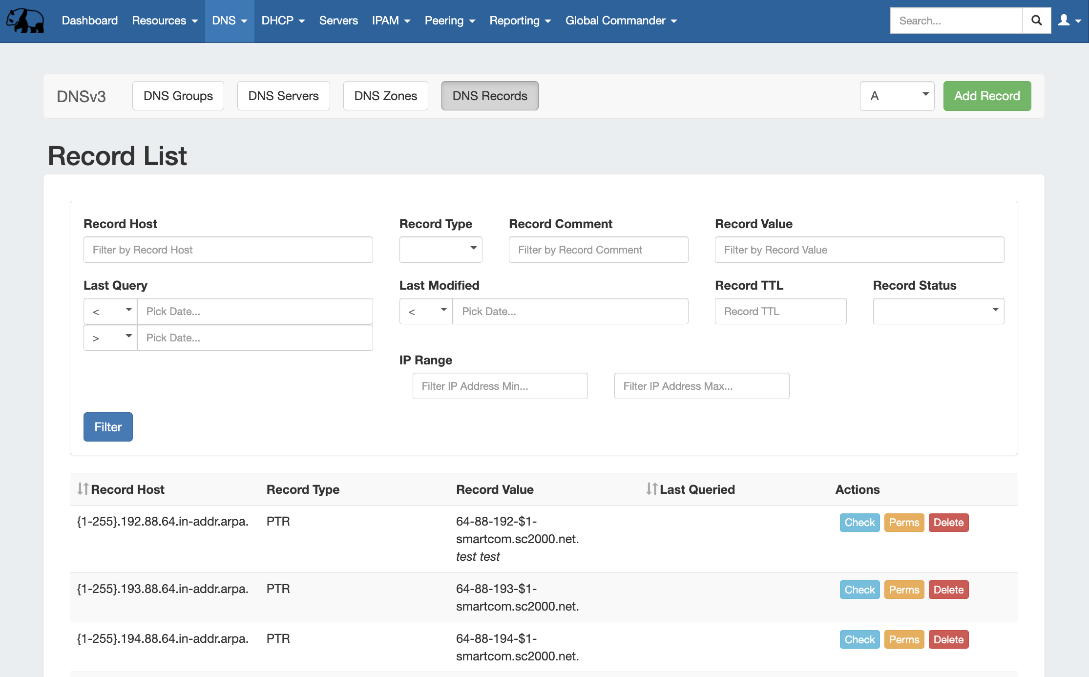 The DNS Records List provides a global list records for expedited searching, filtering, adding, and editing of DNS Records.